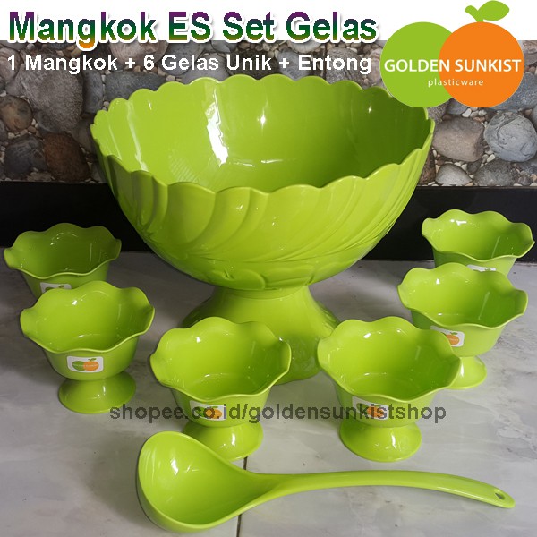 READY HIJAUTempat Wadah Es Buah Set Golden Sunkist - Mangkok Set Gelas Es KrimMangkok Es Buah Set Golden Sunkist, Tempat Wadah Es Krim SetHarga Se-Paket Berisi : 1 Buah Mangkok Besar (MBB 7011 ) ; 6 Buah Gelas Es (GKE 5016); dan 1 EntongTempat Es Buah & Es Krim Lebih Awet dan Tidak Mudah PECAH....Produk Terbaik Untuk Keperluan Setiap Hari.Bahan Plastik Berkualitas Tinggi Sehingga Aman untuk Makanan (Food Grade).Memiliki Design yang Modern dan Terbaru.Warna Menarik dan Mengkilap untuk Tampilan yang Elegant dan Aman.Kuat dan Tahan Lama.Produk Asli Berkualitas SNI.Mudah Untuk Dibersihkan Setelah Pemakaian.Mangkok Ukuran Besar dengan Diameter 21cm dan tinggi 16cmbisa muat banyak....cocok untuk hidangan minuman saat acara pesta atau acar kumpul keluarga..#goldensunkist #paketgoldensunkist #produkgoldensunkist #mangkokgoldensunkist #mangkokesbuah #mangkokes #mangkokesbuahset #mangkoksetgelas #wadahes #wadahesbuah #mangkokesgoldensunkist #wadahesgoldensunkist #mangkokesbuahgoldensunkist #wadahesgoldensunkist #goldensunkis #gelaseskrim #wadaheskrim #mangkoksetgelase