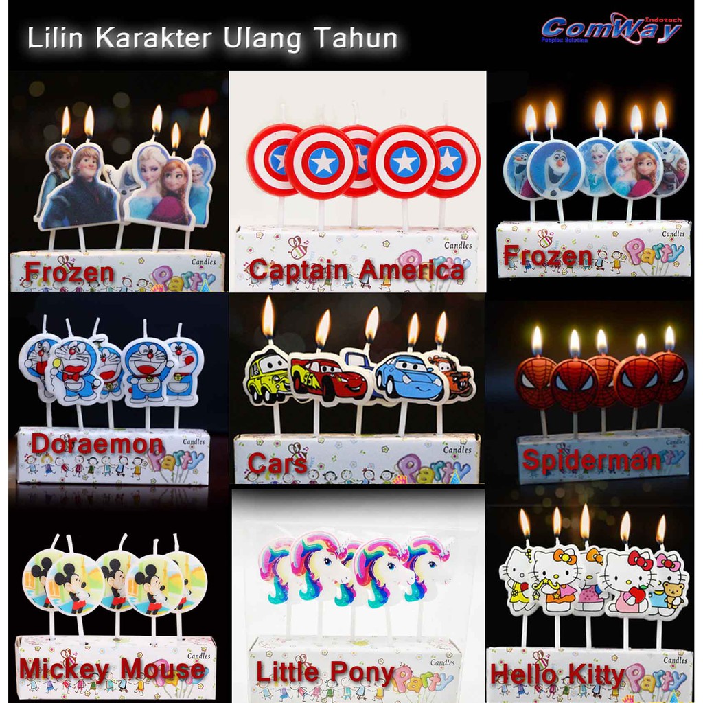 Lilin Ulang tahun KarakterLilin yang cantik dengan karakter yang lucu yang disukai anak-anak akan menghiasi kue Ulang tahun anda, semarak hiasan menjadi punuh warna dan meriah yang tidak terlupakan di acara Special.Description :- Panjang Lilin : 6 cm- Lebar Lilin : 3 cmKarakter :- Mickey Mouse- Frozen - Captain America- Doraemon - Spiderman - Little Pony - Hello Kitty- Cars - ( Stock Kosong)Keterangan : - 1 pack = 5 pcs Lilin Karakter- Harga / pack ( 5 pcs )"Have Party & Birt