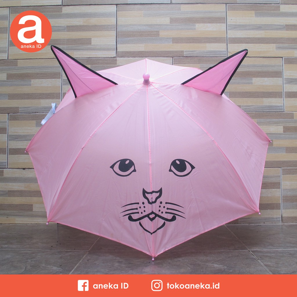 Payung anak lucu dengan karakter hewan berkuping. Cocok untuk buah hati Anda.................................Bahan: NylonJumlah Ruji: 8 buah Diameter: 76 cmTinggi: 58 cmGagang: Plastik...............................