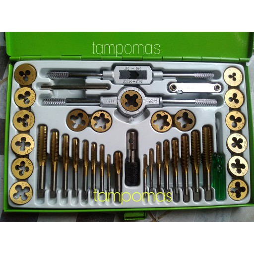 Tap & Senai Set Merk : TEKIRO OriginalType : GT-TD172640 Pc terdiri dari :* 17 PCS DIES SIZE : M3*0.5 , M4*0.7, M5*0.8, M6*1.0, M7*1.0, M8*1.25, M10*1.5, M12*1.75, 1/8NPT27, 4NC40, 6NC32, 8NC32, 1/4NC20, 5/16NC18, 3/8NC16, 7/16NC14, 1/2NC13.* 17 PC TAP : SIZE AS DIES* TAP WRENCH* DIE HANDLE : 1"OD* T-TYPE WRENCH 1/4" CAPACITY* SCREWPITCH GAUGE.* SCREWDRIVER#handtap#tapbalik #tapbautpatah#tekirotools#tekiro#kuncit