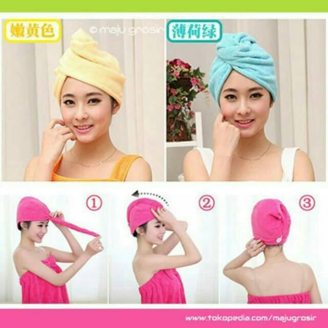 New Magic Towel Microfiber- Handuk Kepala"Magic Towel terbuat dari microfibre (serat )dengan tingkat penyerapan air lebih tinggi dari serat yang normal. Menggunakan Magic Towel Cap, Anda dapat mengeringkan rambut Anda dengan cepat & mudah, menghindari kerusakan rambut yang disebabkan oleh pengering rambut dan juga mencegah kerontokan rambut.Cara Penggunaan:1. Membungkuk ke depan kepala Anda dan turunkan rambut anda secara alami2. Masukkan di topi pengeringan rambut & putar di sekitar rambut.3. Lipat kembali & ikatkan pada kancing di bagian belakang.Lama penggunaan sekitar 15menit, rambut kira2 75kering, kalau ingin 100tinggal ditambah dengan penggunaan hair dryer selama kira2 3-5menit.. rambut sdh bnr2 kering..Cara perawatan handuknya : dicuci menggunakan air bersih, menggunakan tangan, tdk boleh dimasukkan mesin cuci dan tdk perlu pake detergen.Ukuran : 51x19,5 cmReady warna : Pink, ungu, kuningTulis di keterangan warna yang dikehendaki, jika warna yg diminta kosong, akan dikirimkan warna yang