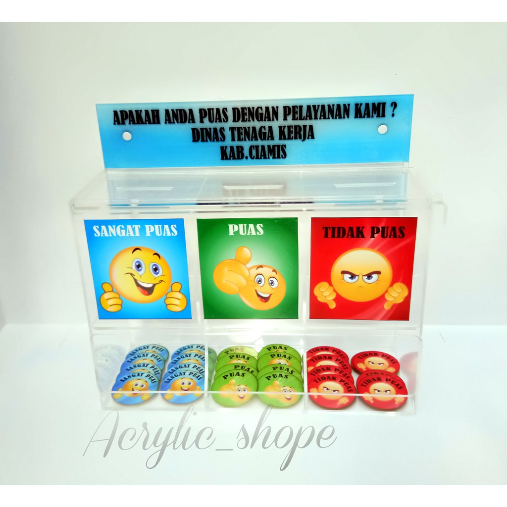 Material : akrilik 2 mm clear ukuran : 28 x 10 x 22 cmterdiri dari 3 kotak yaitu puas, tidak puas dan kritik saranUntuk koin dijual terpisah silakan order ada di katalog kamicara order : tulis diketerangan untuk tulisan yang akan digantibisa costom gambar,ukuran bentuk,tulisa