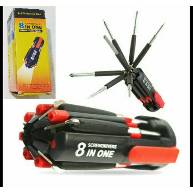Anda sering kesal karena beberapa jenis obeng anda sering hilang / tercecer ???Anda sering kesal saat melakukan aktivitas pertukangan seperti membuka baut tiba2 lampu mati ? Ataupun anda biasa bekerja ditempat gelap karena tuntutan profesi ?Telah Hadir !!!Obeng Multifungsi dilengkapi dengan 8 Jenis Obeng berbagai ukuran disertai dengan Lampu Sinar yang Terang Benderang !!Kegunaan :1. Memiliki 8 Jenis Obeng dari yang Besar sampe yang Terkecil dan ber-Magnet sehingga memudahkan sekali untuk pengerjaan pada sekrup kecil.2. Pekerjaan Rumah tidak Repot lagi, tidak perlu mencari-cari Obeng dengan jenis tertentu, cukup 1 alat semua teratasi.3. Memiliki Lampu Sinar yang terang benderang sehingga memudahkan pengerjaan di sudut sempit, gelap dan pada saat Listrik Mati, sangat membantu.4. Kuat dan Kokoh tidak gampang Rusak !!5. Bentuknya Simple, Handy dan Praktis, mudah untuk dibawa kemanapun (Persiapan saat Berkendara, di Rumah, di Kantor dll)Spesifikasi Produk :1. Menggunakan batery AAA - 3 pcs untuk lampu senter (Tidak Termasuk)Posisi baterai yang 2 positif menghadap atas, yang 1 negatif hadap atas (++-)2. Handle Material dari ABS3. Material Obeng terbuat dari baja4. dilengkapi dengan kotak untuk pakingnya5. Warna hitam - Merah6. Ukuran : 8cm x 4.8cm x 14cm.#obeng #obeng8in1 #obengmultifu