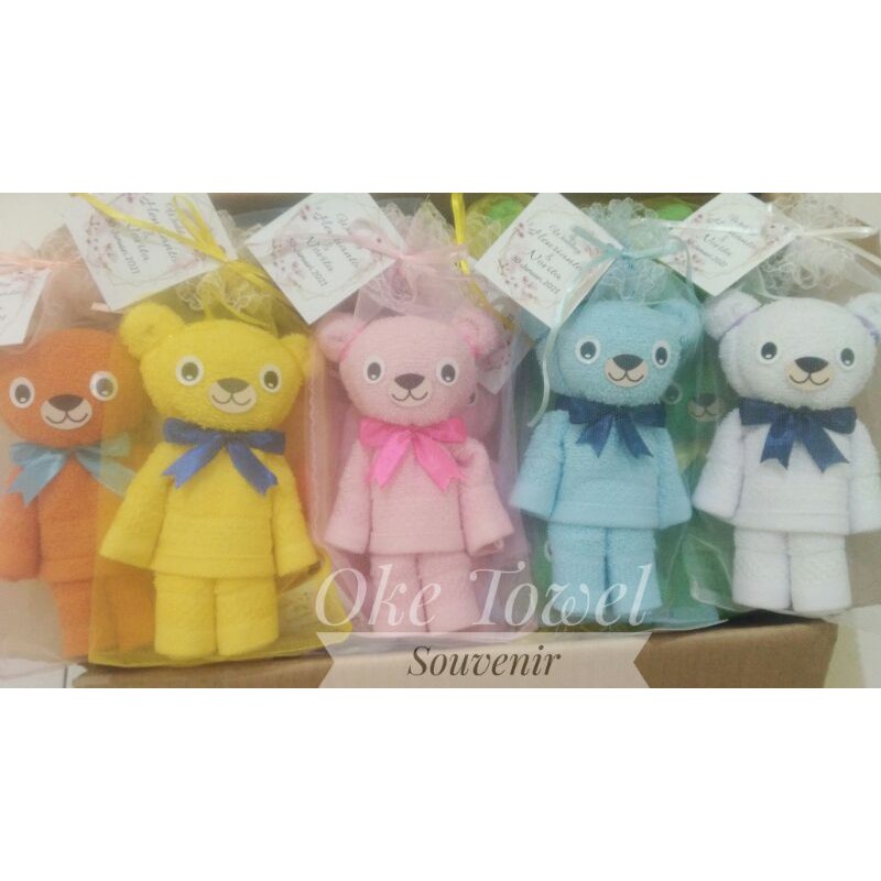Bear Towel SouvenirSouvenir unik ini di buat dari handuk katun daya serap baik, halus, lembut merk anjoly. ukuran handuk nya 30x30cm. Handuk di jahit rapi ke 4 sisanya. Souvenir tidak menggunakan lem yang merusak handuk. Handuk dapat di pakai kembali ketika lipatannya di buka.Di kemas dengan kain tille.tersedia berbagai pilihan warna. Silahkan chat untuk warna yang tersedia.Ukuran Souvenir nya tinggi sekitar 18cm dan lebar 8cmBonus free kartu ucapan untuk pesanan min 30pcs jika membutuhkan.Cocok sekali untuk acara pernikahan, ulang tahun anak, aqiqah, syukuran kelahiran anak,