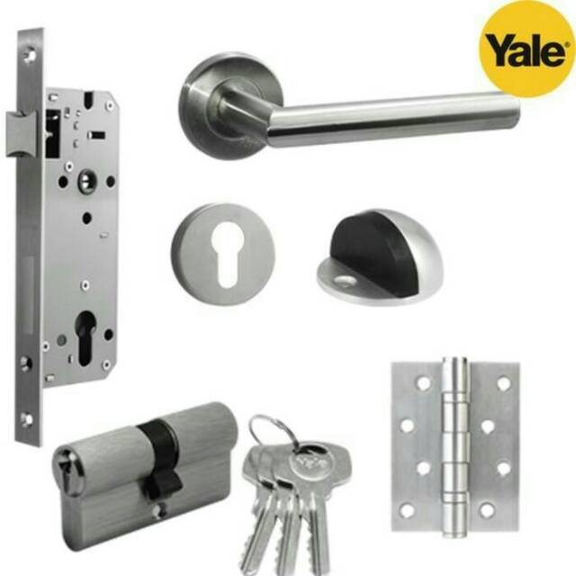 Tubular SS lever handle on rose SET with mortice and cylinder DP 60mm + Hinges + door stop.Finish : Stainless Steel. Handle pintu yang terbuat dari stainless steel,tidak mudah berkarat, elegan untuk di pakai di luar dan dalam ruangan, dan tahan untuk cuaca apapun. 1 paket 5 in 5 berisi handle, mortice 28P3.40, cylinder 60mm, engsel, door st