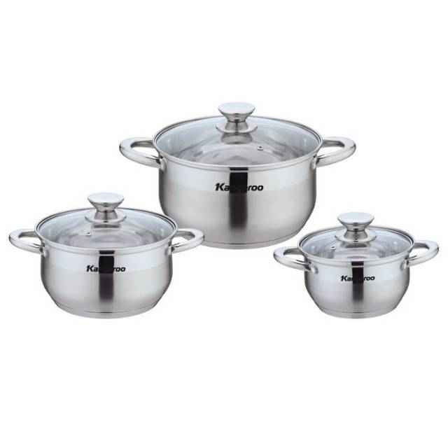 Kangaroo Cookware 3 Set KG 868Features :Menghadirkan cookware set atau panci 3 set dengan ukuran 16cm, 20 cm, dan 24 cm dibuat dengan 5 lapisan dibawahnya, yaitu :Lapisan pertama dan lapisan kelima : merupakan lapisan inox / stainless steel dan pada lapisan kelima terdapat lapisan inox 430 / stainless steel 430 dengan campuran nano berkualitas tinggi yang membuatnya anti lengket, anti gores serta membuat makanan anda menjadi lebih sehat dan higienisLapisan kedua dan lapisan keempat : merupakan lapisan alumunium yang membuat makanan menjadi lebih lama dalam mempertahankan kehangatannyaLapisan ketiga : terbuat dari lapisan metal membuat hantaran panas menjadi lebih cepat menyebar kesegala permukaan panciTambahan fitur lainnya:Terdapat lubang steam pada bagian penutupnyaMemilki handle panci yang nyaman dipegangTutup panci terbuat dari bahan kaca tebal anti pecahAnti penyokCocok digunakan pada kompor induksi, kompor listrik dan kompor infrared.SPECIFICATIONSModel KG-868Bahan Stainless steelWarna SilverKelengkapan Panci 16 cm, 22 cm, 24 cmBerat 3.1 Kg#panci #panciset #pancistainlesssteel #pancistainless #pancistainlessmurah #pancikang