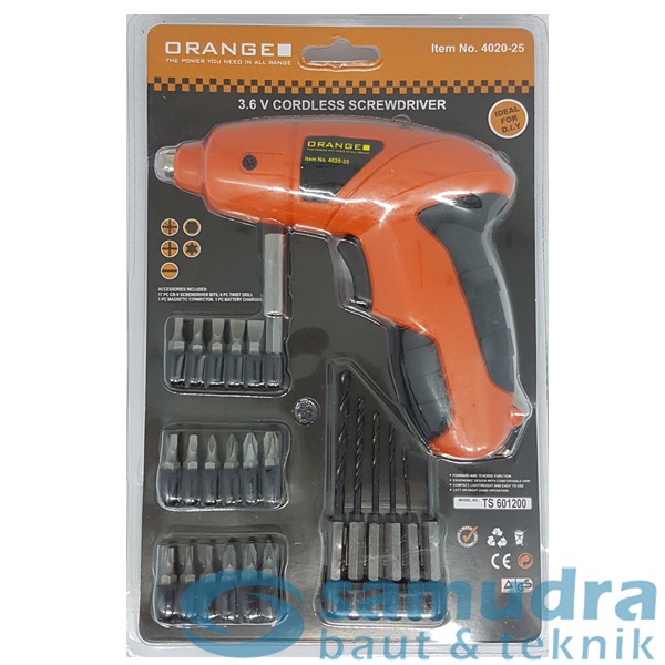 Highlight Produk :- Desain ergonomis dan nyaman digenggam- Ringan dan mudah digunakan- Dapat digunakan untuk pengeboran kayu triplek, PVC, plastik, aluminium- Arah pengeboran bisa bolak balik- Cocok untuk penyekrupan baut yang ringan seperti furniture- Sudah termasuk mata bor set dan mata obeng setMemperkenalkan ORANGE 3.6V Cordless Screwdriver, mesin bor obeng yang menggunakan daya baterai. Mesin bor ini didesain ergonomis dan nyaman saat digenggam serta ringan dan mudah digunakan. Mesin bor ini dapat digunakan untuk pengeboran papan triplek tipis dengan arah pengeboran dapat bolak balik. Mesin obeng baterai untuk penyekrupan baut yang ringan. Sudah termasuk mata bor set dan mata obeng set.Spesifikasi :- Item No. : 4020-25- Sumber tegangan : 3,6 V dapat diisi ulang- Baterai : 600 MAH IN CD- Charger : 6 V, 240 V / 50 Hz- Kecepatan tanpa beban : 180 RPM- Kapasitas kepala bor : 6,35 mm- Torsi : 3 Nm- Lama pengisian ulang baterai : 3 - 5 jam- Sudah termasuk charger untuk isi ulang baterai- TIDAK BISA UNTUK PENGEBORAN TEMBOK, BETON, DAN BESI.Kelengkapan Produk :1 unit mesin bor1 buah charger17 pcs mata obeng6 pcs mata borPerhatian :Gunakan kacamata pengaman dan sarung tangan untuk perlindungan.ORANGETHE POWER YOU NEED IN ALL