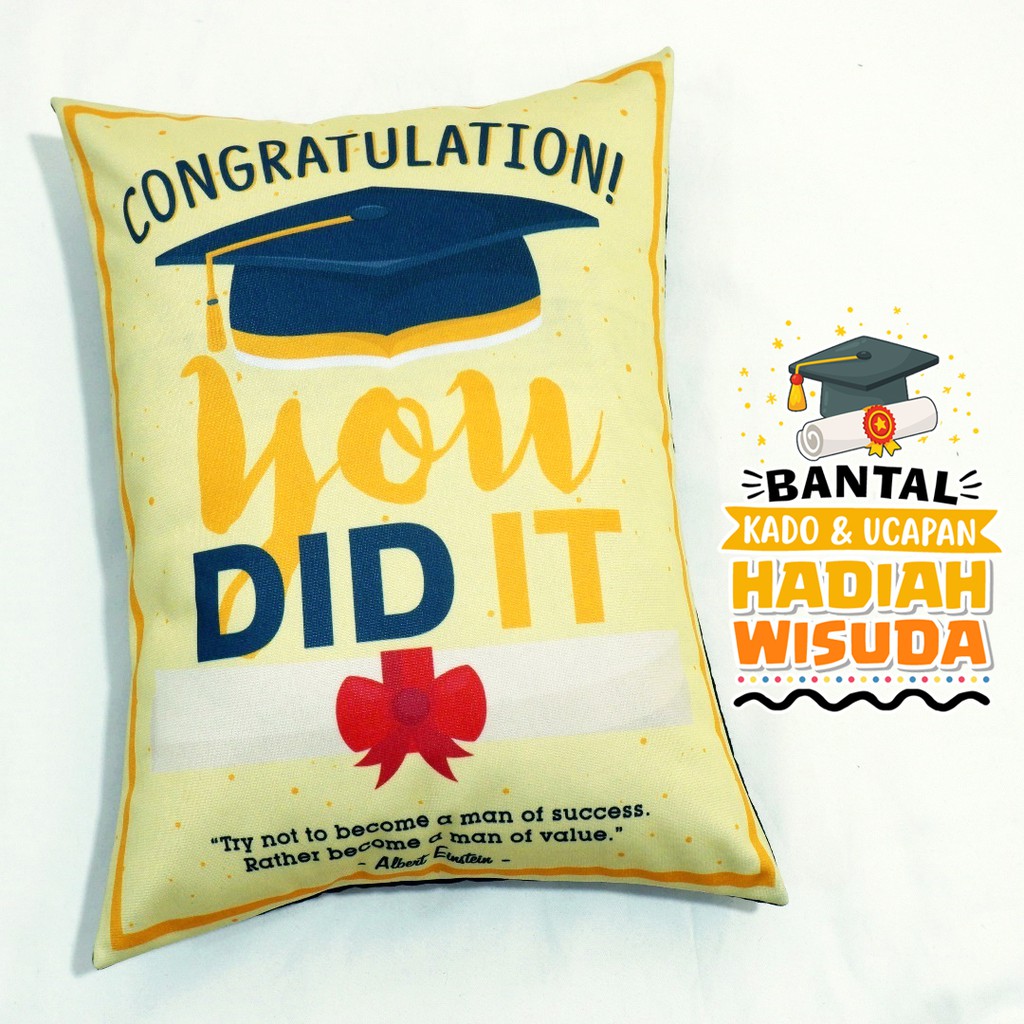 KADO WISUDA BANTAL UCAPAN TEMA YOU DID IT. Size 30x40cm. Ready Stock/Siap Kirim.(Bantal + GRATIS Kartu Ucapan).Bantal lucu, unik dan menarik. Cocok untuk jadi hadiah spesial, sebagai kenang-kenangan, tanda cinta atau kado kejutan untuk orang yang kamu sayang. Kualitas bahan terbaik, tidak luntur, tebal dan lembut. GRATIS KARTU UCAPAN yang bisa kamu tulis sendiri.Jika order mau dikirim langsung ke penerima hadiahnya, kamu bisa kirim pakai metode DROPSHIP, Untuk kartu ucapannya bisa kita bantu tuliskan, Tulis saja isi ucapannya di "Catatan Order".BISA PAKAI BUNGKUS KADO. Untuk order bungkus kadonya bisa cek Kategori Produk toko kita "Tambah Bungkus Kado".LIHAT TEMA DAN KOLEKSI BANTAL KADO LAINNYA dikategori produk toko kita.*NOTE: Desain dan tulisan tidak bisa di edit/rubah. Dalam paket pengiriman TIDAK ADA struk atau info harga.*Tersedia pengiriman kilat via GOSEND dan GRAB jika lokasi terjangkau.*Untuk RESELLER, langsung saja order pakai metode Dropship yahh.*Stok terbatas, Buruan order sebelum kehabisan :)Terima Kasih, Say it with pillows